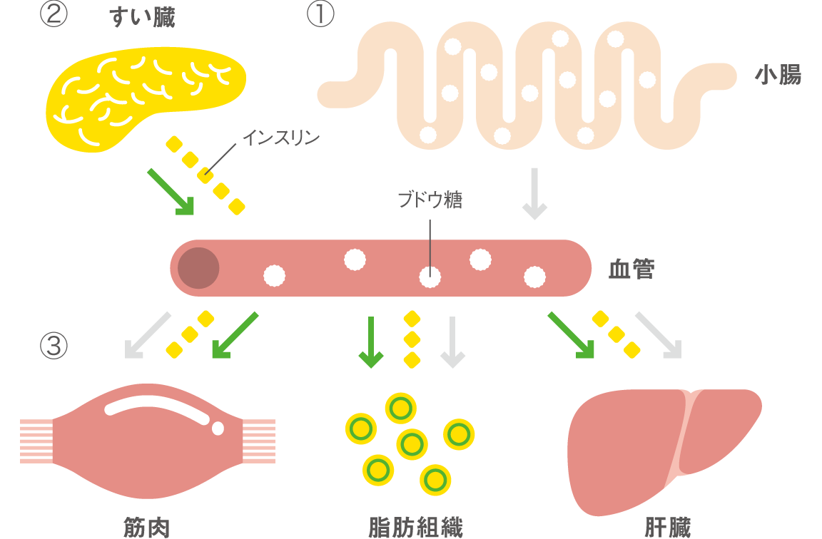 インスリンは、血液中のブドウ糖の濃度(血糖)によってすい臓から分泌されます。このインスリンの分泌の量および速度が不足してくると、十分に血糖が下げられなくなり、一定の基準を超えると「糖尿病」と診断されます。