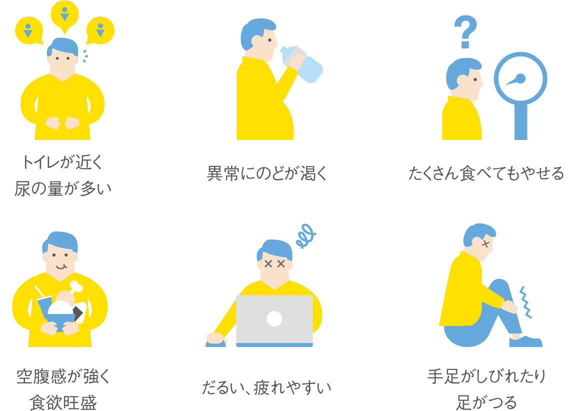 糖尿病は初期(血糖コントロールが良好、合併症が無い)状態では自覚症状に乏しい病気です。ここに示すのは、血糖コントロールが不良、または合併症が進行した状態の一般的な症状です。(つまり、悪化しないと症状が出てこない病気でもあります。)このような症状は、血糖コントロールが良好になることによって消失したり、軽減したりすることがあります。