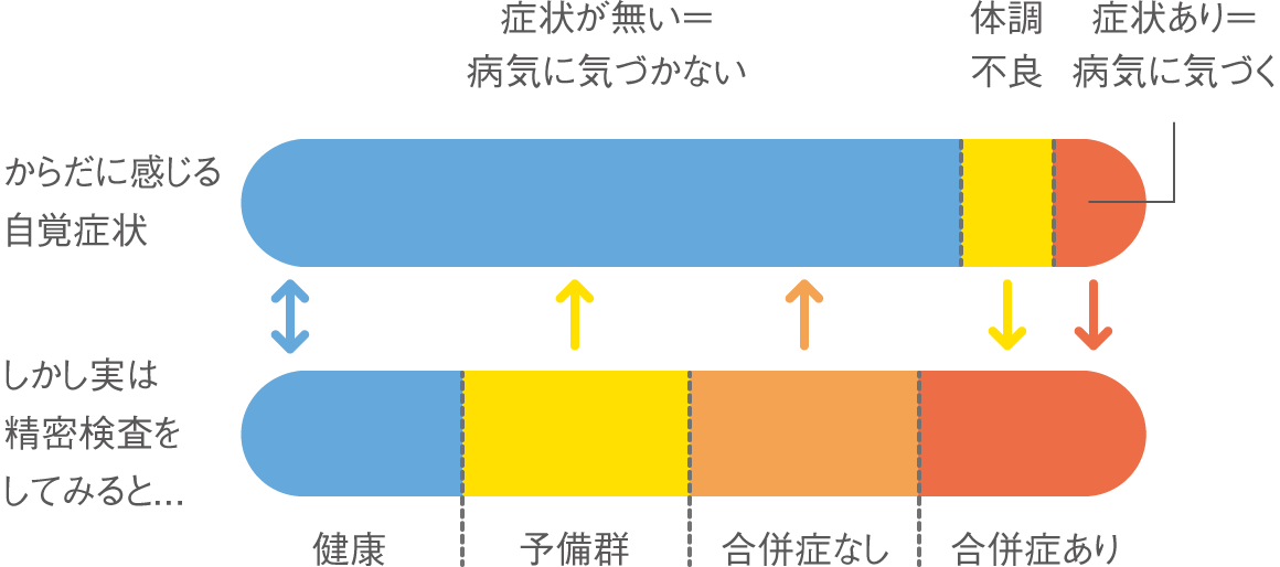 糖尿病の合併症は、一般的には血糖コントロールが不良であると日々少しずつ進行するため気づいたら進行しているというケースが多いです。そのため定期的な診察による状態の把握が大切です。