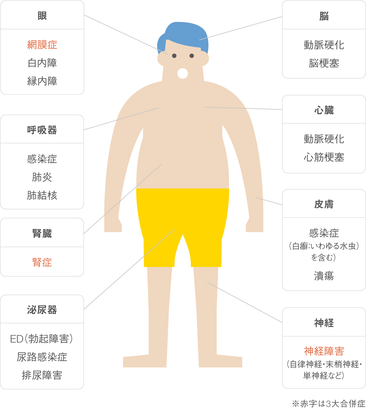 糖尿病は合併症という別の病気を引き起こすことがあります。合併症があるのかどうか、あるならどのくらい進んでいるのかを定期的に診ます(ふだんは症状があまり無いので定期的に検査する必要があります)。