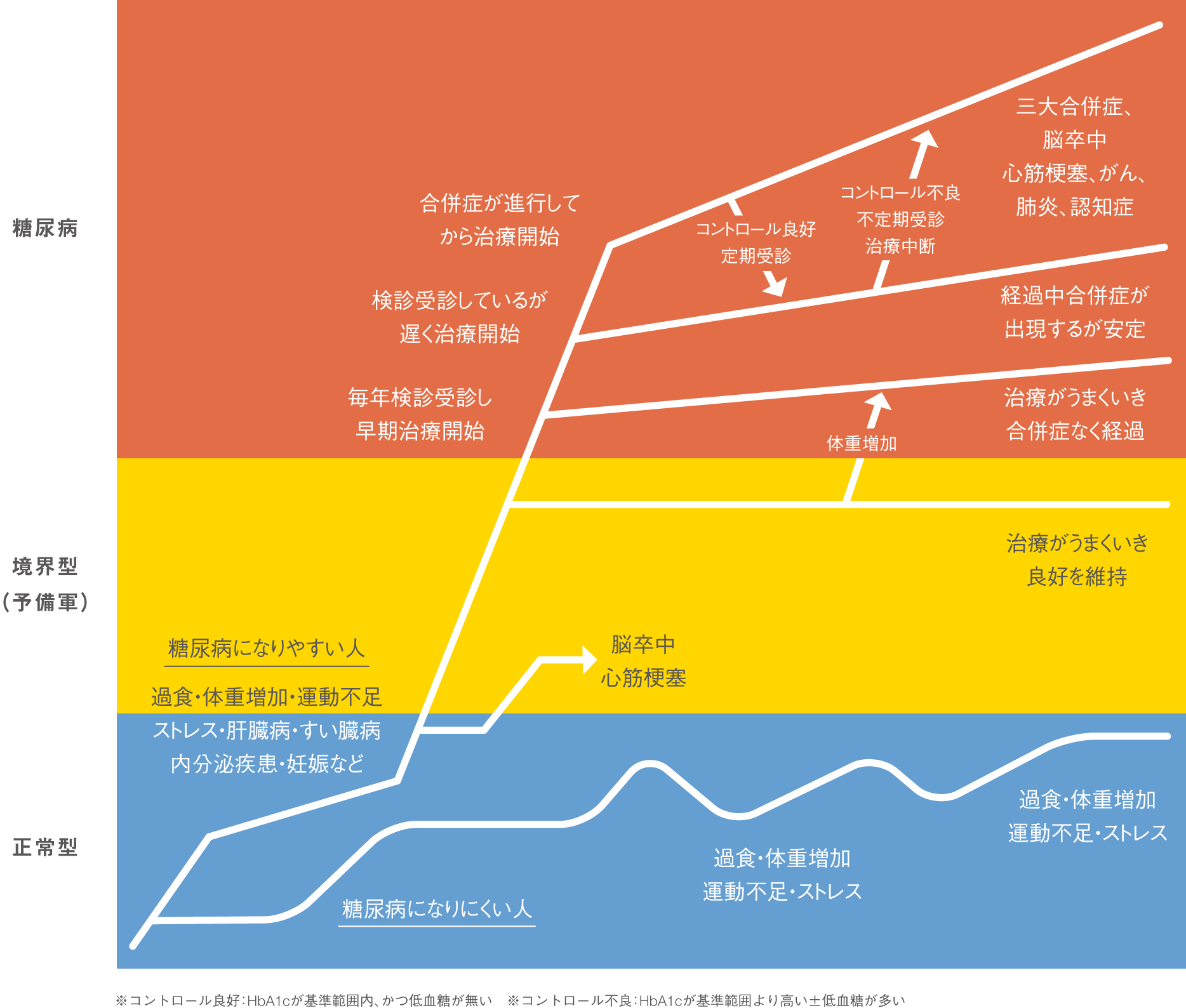 ここに示す通り、糖尿病になりよほど血糖が高いか合併症が進行しない限り自覚症状は感じられないため、検診などで「血糖が高い(高め)」「尿糖が少し出ている」などと言われた時点で精密検査(糖負荷試験)を行って自分がどの段階にあるのかを診断すべきです。